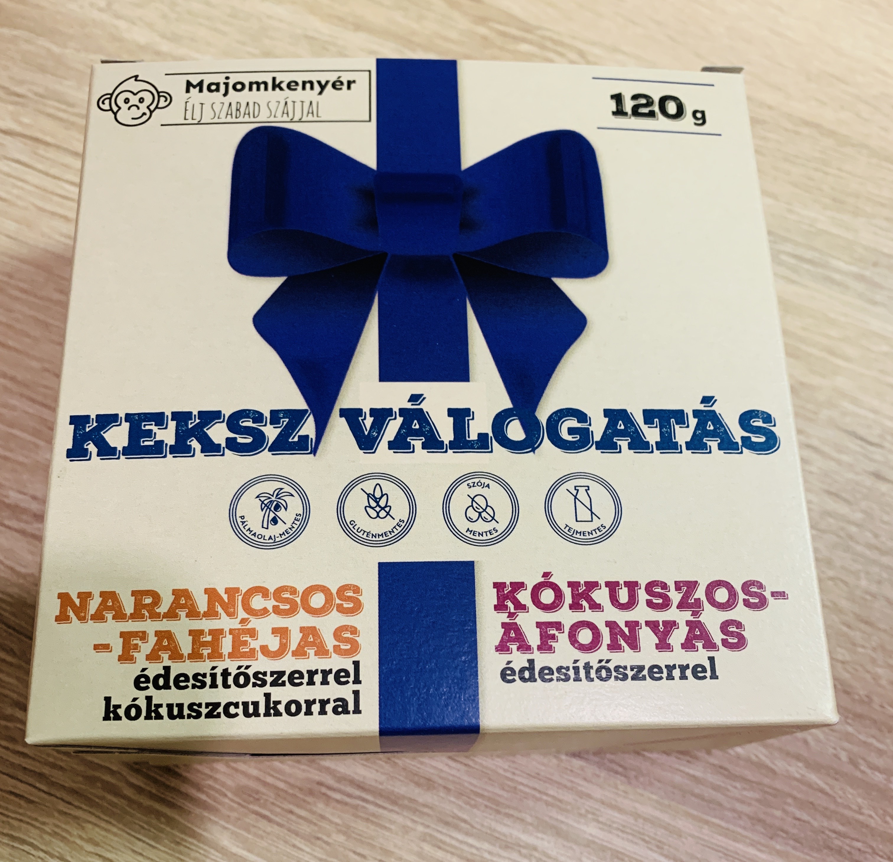 A Majomkenyér gluténmentes, tej felhasználása nélkül készülő karácsonyi keksz válogatása két, a klasszikus Narancsos-Fahéjas és a Kókuszos-Áfonyás ízvilágot tömöríti magába. Tökéletes finomság a karácsonyi ünnepekhez, vagy ajándéknak is kiváló. Gluténmentes, tejmentes, szójamentes, pálmaolaj-mentes, élelmirost-forrás. Nem tartalmaz mesterséges színezékeket, tartósítószereket. Átlagos tápértéktartalom 100g termékben: Narancsos-Fahéjas keksz édesítőszerrel: Energia 1684 kJ, 405 kcal, Zsír 22 g, amelyből telített zsírsavak 12 g, Szénhidrát 52 g, amelyből cukrok 23 g, ebből poliolok 7,8 g, Rost 5,6 g, Fehérje 5,3 g, Só 0,2 g. Összetevők: Kókuszvirág cukor, tápióka keményítő, darált dióbél, növényi zsír (kókuszzsír), tojás, édesítőszer (eritrit), kókuszliszt, narancssűrítmény (7,5%), bambuszrost liszt, útifűmaghéj, őrölt fahéj (0,6%), citromsűrítmény, antioxidáns (aszkorbinsav), térfogatnövelő szerek (nátrium-karbonátok), vanlilin. Áfonyás-Kókuszos keksz édesítőszerrel: Energia 1840 kJ, 442 kcal, Zsír 27 g, amelyből telített zsírsavak 16 g, Szénhidrát 38 g, amelyből cukrok 6,3 g, ebből poliolok 17 g, Rost 8,9 g, Fehérje 9,2 g, Só 0,2 g. Összetevők: Kókuszliszt (18%), mandulaőrlemény, édesítőszer (xilit), tojás, növényi zsír (13%) (kókuszzsír), tápióka keményítő, aszalt vörösáfonya almasűrítménnyel (5%) [áfonya (55-70%), alma koncentrátum (30-45%), napraforgóolaj (0,1-1%)], kókuszreszelék (3%), citromsűrítmény, útifűmaghéj, antioxidáns (aszkorbinsav), térfogatnövelő szerek (nátrium-karbonátok), vanilin. Nyomokban földimogyorót és más dióféléket is tartalmazhat.Túlzott fogyasztása hashajtó hatású lehet.